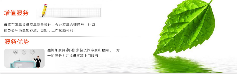 深圳市鑫銘東家具有限公司專業銷售各類辦公家具!產品涉及多種系列,如:班臺、班椅、屏風、會議桌、會議椅、辦公沙發、茶幾、辦公桌、文件柜、電腦桌椅、各式餐臺、餐椅、書柜等辦公家具。 鑫銘東家具擁有一批優秀的家具設計、生產及營銷的專業人士和高素質的管理隊伍。銘東家具以"先難后易"之戰略,在產品結構、產品質量及服務水平方面,均推陳出新,力求完善,精益求精。使我們的產品質量保持在國內外家具潮流的先進水平,力求滿足客戶的特殊需求。鑫銘東家具多年來致力于環保、實用家具的設計與開發,集生產、銷售、服務于一體。本著"以人為本"的設計理念,大量開發符合人體工程學的各種產品,以"誠信為本"的質量方針,真材實料,認認真真做產品,實實在在做人。鑫銘東家具更致力于創造"零維修率"的制造境界,實現"沒有維修的服務才是最好服務"的口號》了解更多